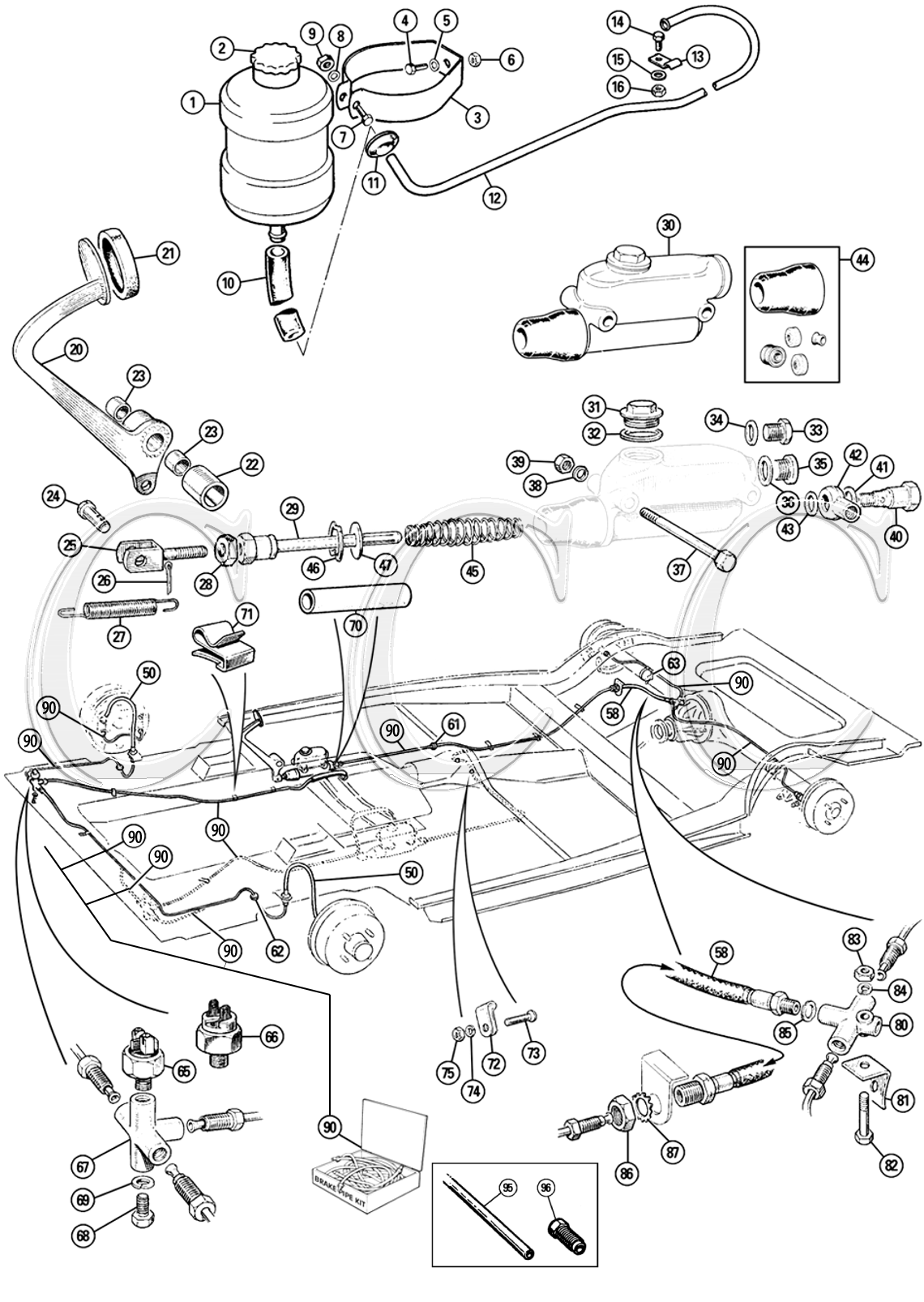 Hinweis: Alle Bremsleitungen werden aus Kupfer hergestellt, auf Länge geschnitten und aufgeweitet geliefert, entweder mit BSF oder UNF-Gewinde. UNF-Gewinde werden nur bei den Radzylinderbrückenleitungen verwendet. Alle anderen an der Karosserie montierten Leitungen verwenden BSF-Gewinde. Die Leitungen müssen zur Montage in die korrekte Form gebogen werden. | ||||||